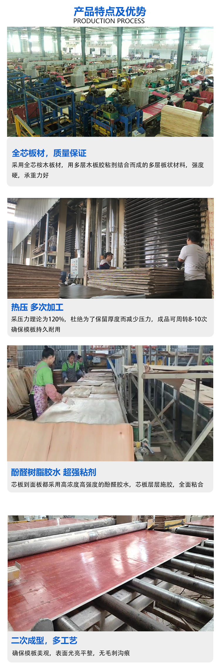 表面平整光滑,容易脫模;耐磨性強;防水性好;模板強度和剛度較好,使用壽命較長;材質(zhì)輕,適宜加工大面積模板,能滿足清水混凝土施工的要求。