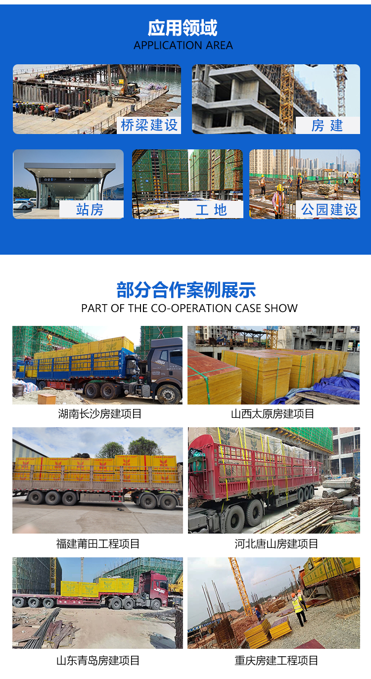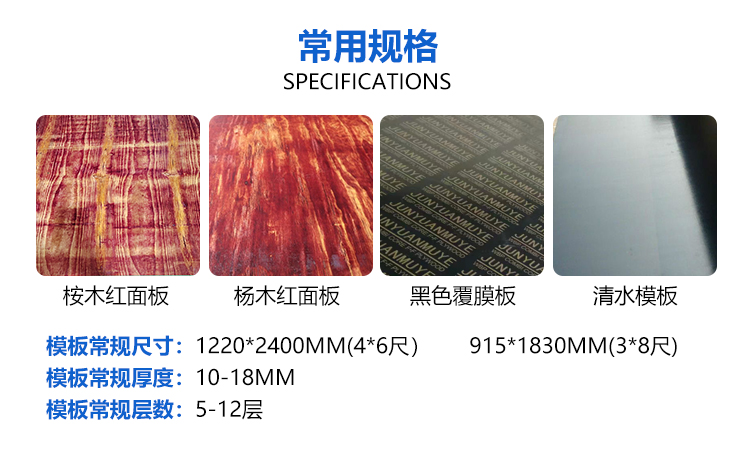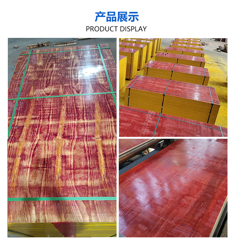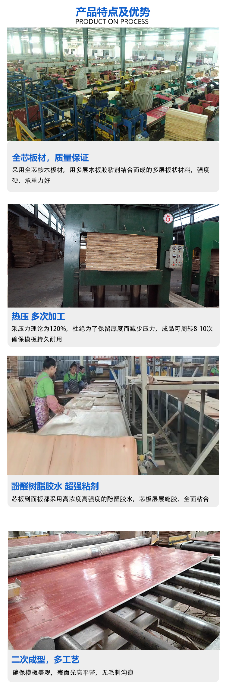 2、建筑模板表面涂層為防水性能強(qiáng)的酚醛樹(shù)脂膠,芯板采用三氨膠(單層過(guò)膠達(dá)0.45KG),采用層層過(guò)膠;