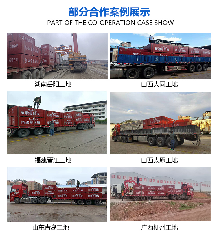 2、本產(chǎn)品表面覆膜為紅色膜紙。高強(qiáng)度橋梁模板采用精品竹簾縱橫交錯排列,輔以酚醛樹脂膠水,經(jīng)高溫高壓而成,其承受的強(qiáng)度相當(dāng)于木模板的4-10倍。承受強(qiáng)度高、韌性好,且表面光滑平整。